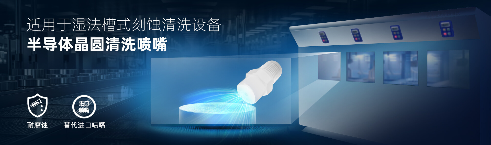 產品:實心錐噴嘴 應用: 噴嘴安裝于槽式濕法刻蝕設備里,通過配合不同化學藥液,有效去除晶圓表面顆粒、有機物和金屬離子,應用于晶圓制造、MEMS制造,以及功率器件制造領域。 工業噴嘴專業制造商🔥 品質可靠·規格齊...